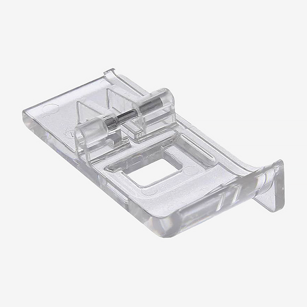 Лапка выполнена из прозрачного пластика, благодаря чему она позволяет контролировать процесс выполнения строчки, а направляющая на лапке помогает прокладывать ровный шов при окантовке среза косой бейкой или шить параллельно краю при подгибке низа изделия.